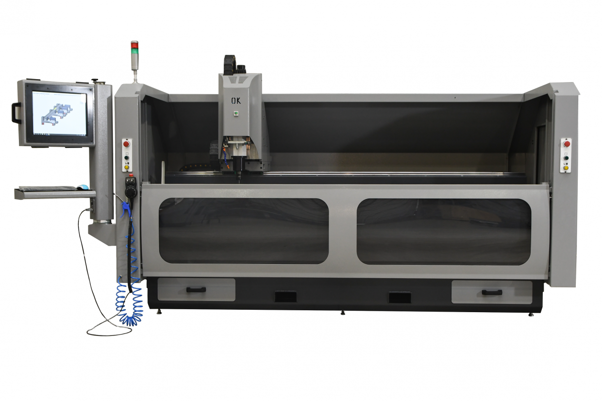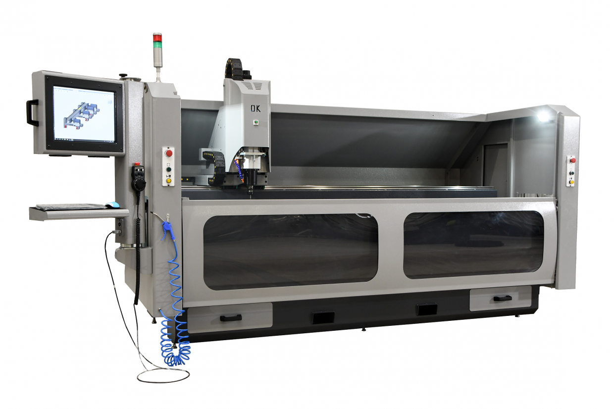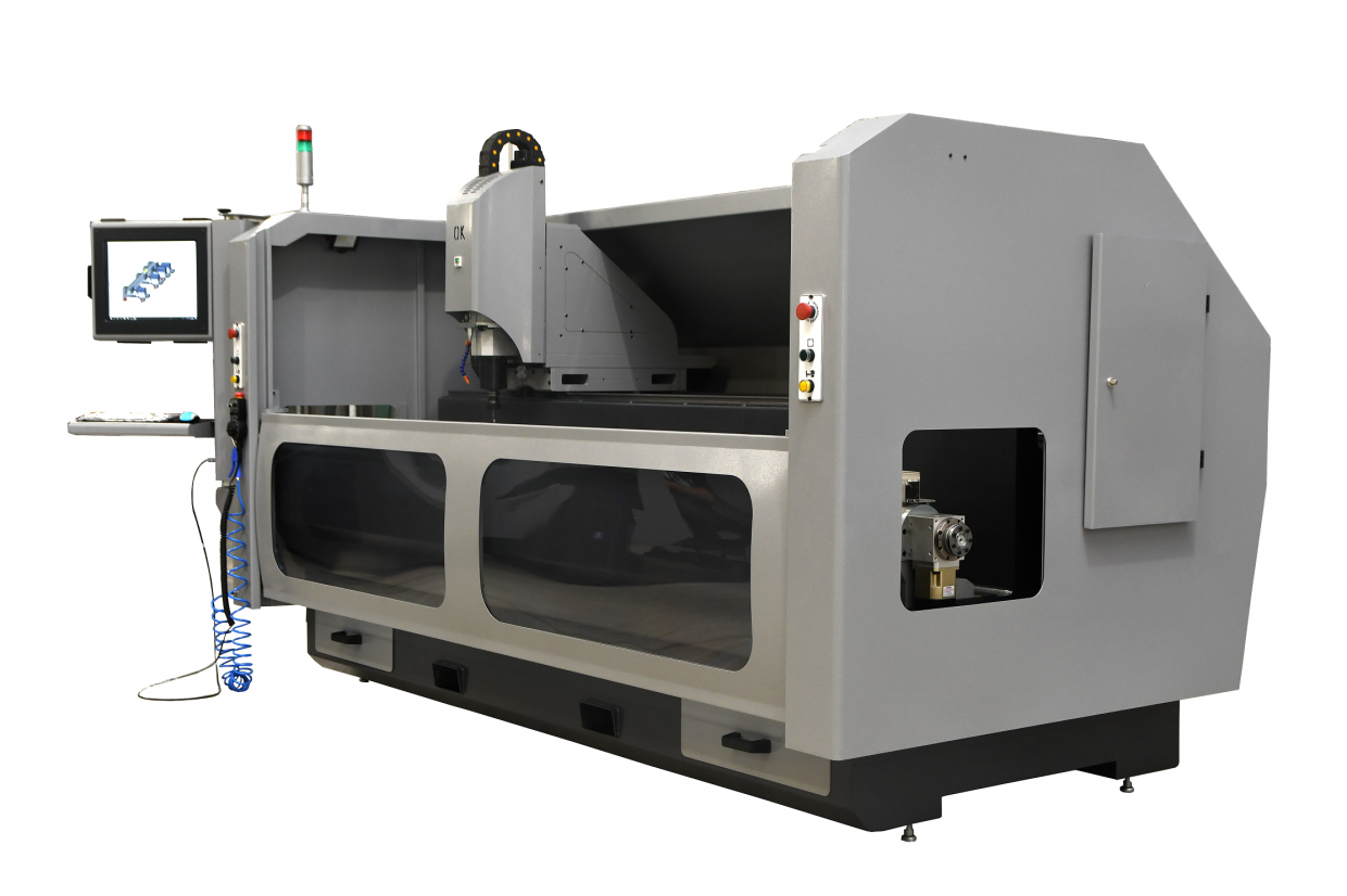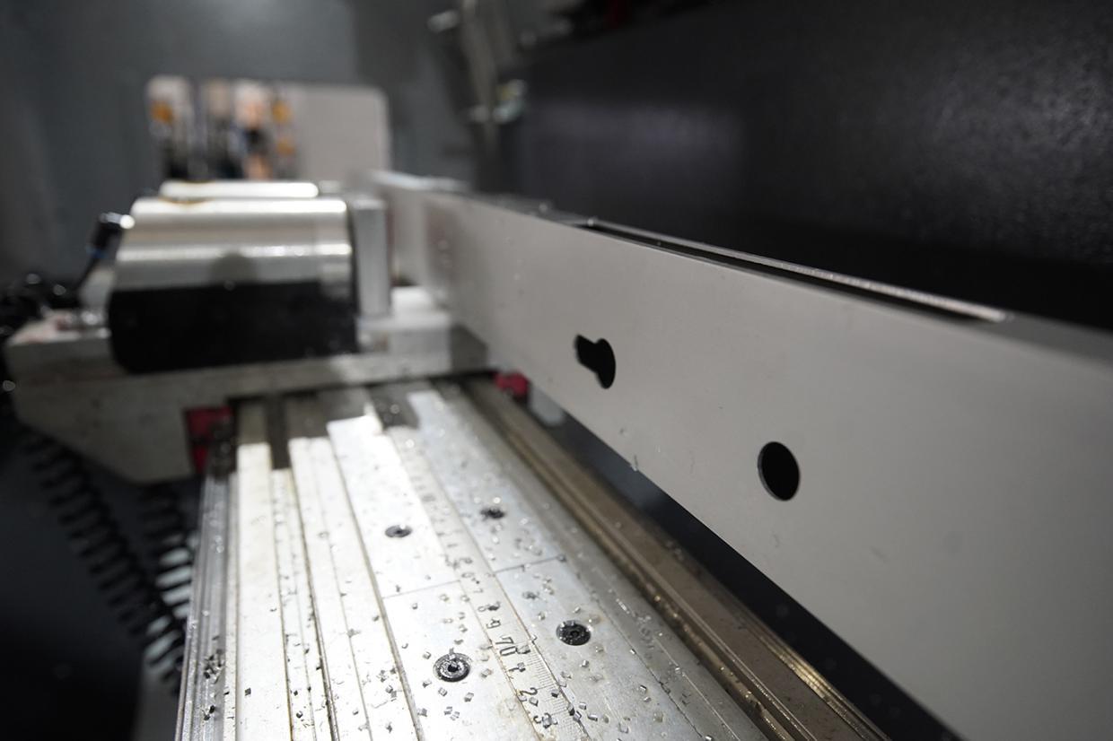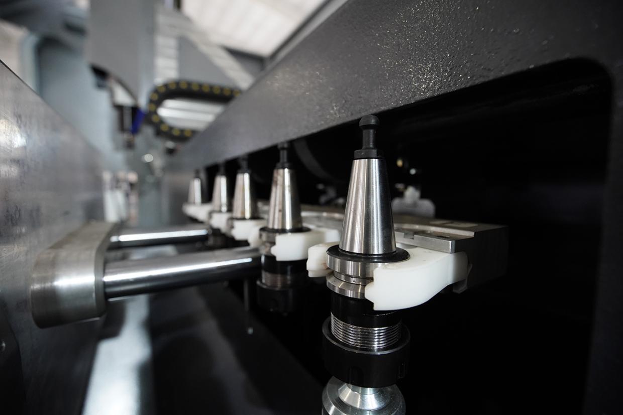 Centro de mecanizado de 3+1 ejes comandados por CNC diseñado para el trabajo sobre perfiles de aluminio, PVC y aleaciones metálicas livianas (ferrosas o no ferrosas), con bancada rotativa eléctrica para trabajar ángulos entre +90º y -90º y todos los ángulos intermedios, con cambio automático de 6 herramientas estándar ISO 30, construido con bancada monocasco, mecanizada, en una sola pieza, equipada con guías prismáticas en los 4 ejes.