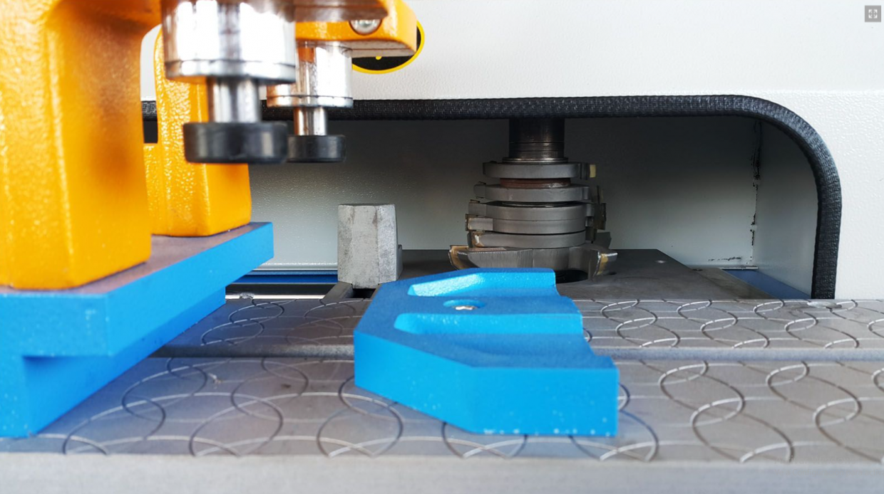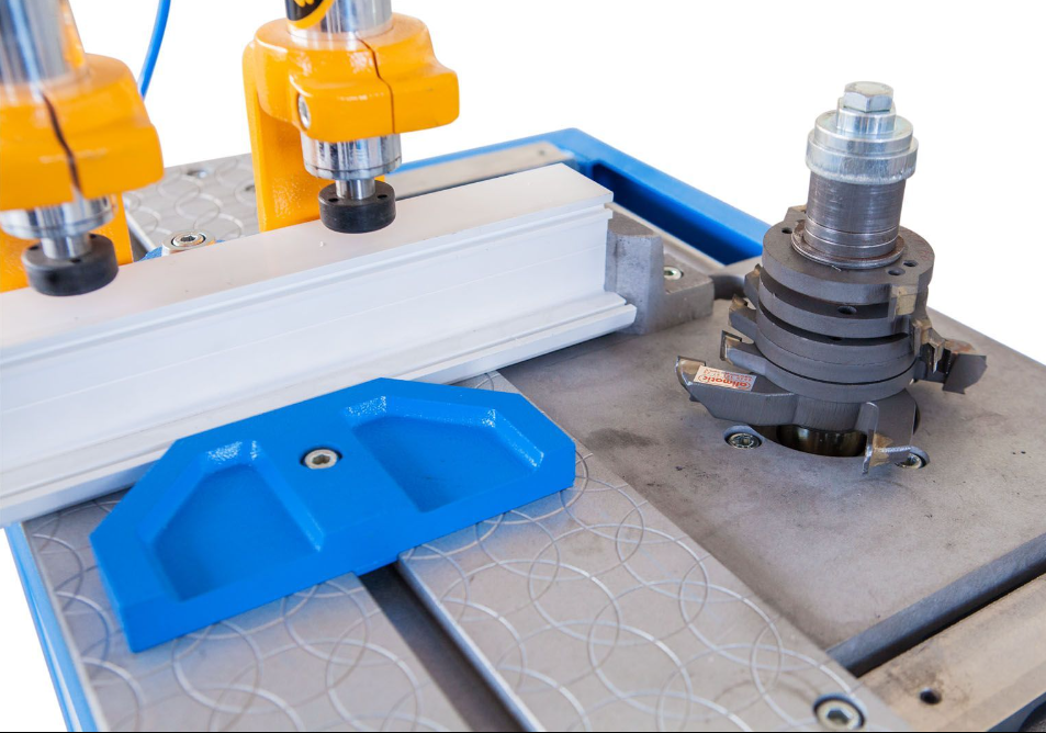 Sujeción de la pieza a mecanizar mediante 2 pistones neumáticos.