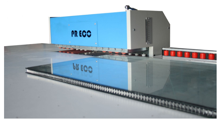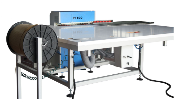 Mesa microperforada con colchón de aire para fácil desplazamiento de los paños de cristal.